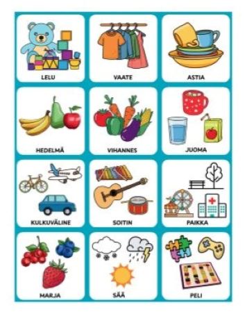 36 yläkäsitekorttia tekstillä ja ilman tekstiä, 2 pelipohjaa, taustakuvat muistipeliin (15 sivua)