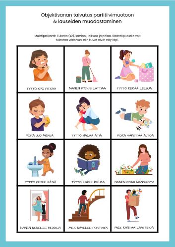 Muistipeli, jossa voi harjoitella objektisanan taivutusta partitiivimuotoon. Verbin taivutus preesensiin. Muodostetaan kolmen sanan lauseita.