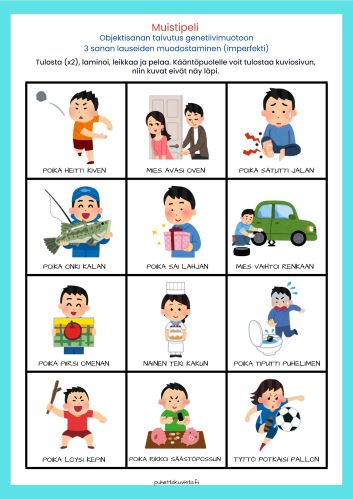 Muistipeli, jossa voi harjoitella objektisanan taivutusta genetiivimuotoon. Verbin taivutus imperfektiin. Muodostetaan kolmen sanan lauseita