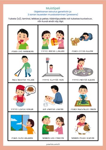 Muistipeli, jossa voi harjoitella objektisanan taivutusta genetiivimuotoon. Verbin taivutus preesensiin. Muodostetaan kolmen sanan lauseita.